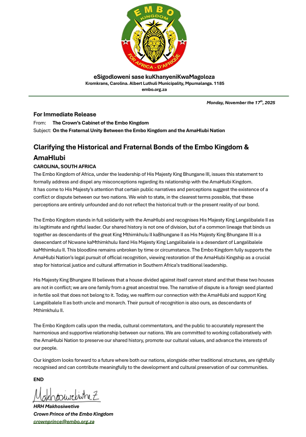 A press release to formally address and dispel any misconceptions regarding the Embo Kingdom's relationship with the AmaHlubi Nation. The Embo Kingdom stands in full solidarity with the AmaHlubi Nation and recognises His Majesty King Langalibalele II as its legitimate and rightful leader. Our shared history is not one of division, but of a common lineage that binds us together as descendants of the great King Mthimkulu II kaBhungane II. This bloodline is a sacred bond that time and circumstance have not broken.